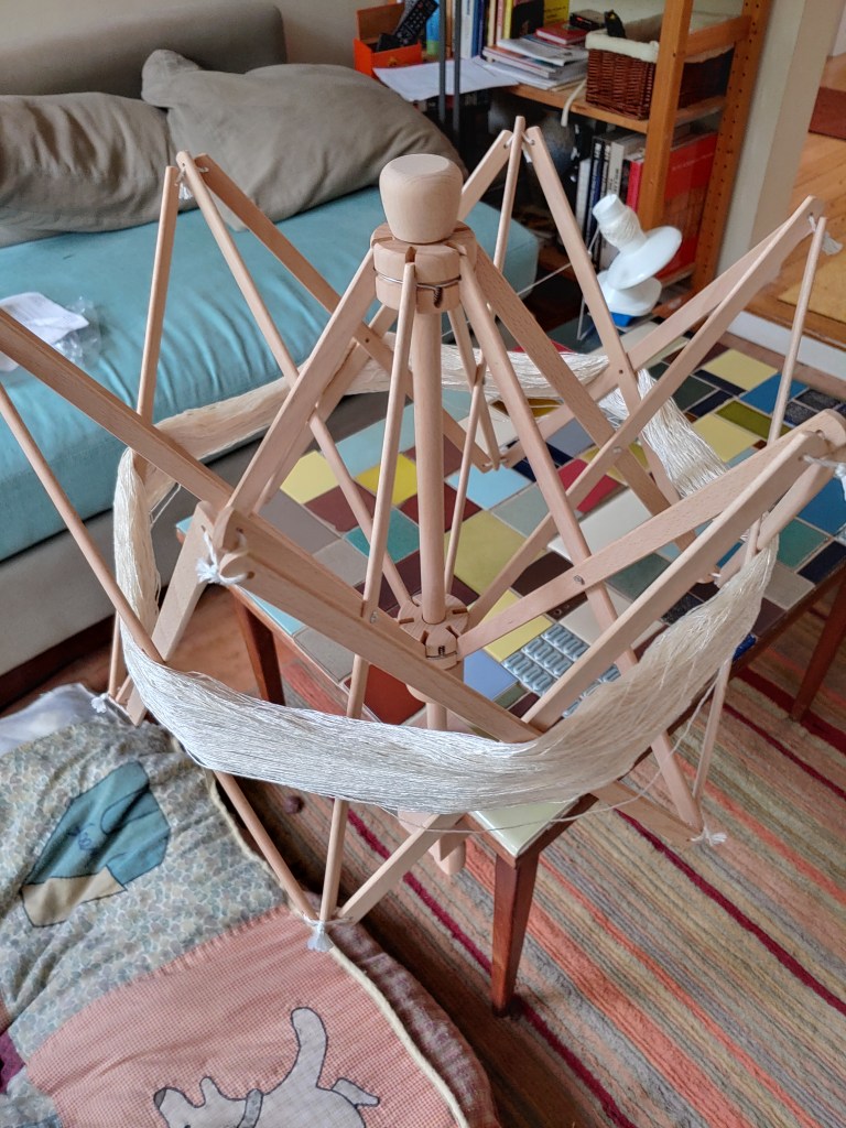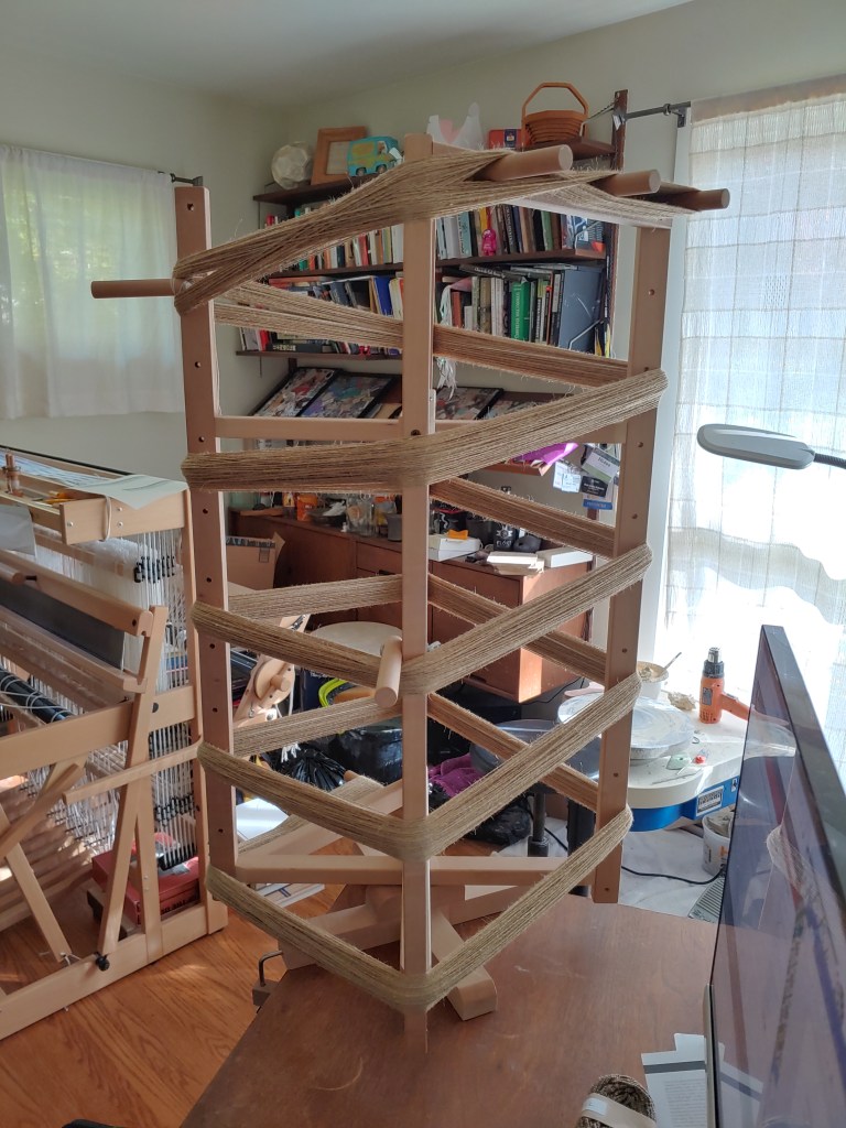 I decided to go with a linen/silk blend for the warp (it’s really strong and has nice texture) and a finer silk yarn for the weft. The linen/silk came spooled so it was ready to reel out, but the weft yarn came in skeins that needed to be converted to center-pull balls. The right image below shows about 230 8-yard warp ends reeled out on my warping mill; the left image shows a skein of the weft yarn on my swift with the ball winder behind it: