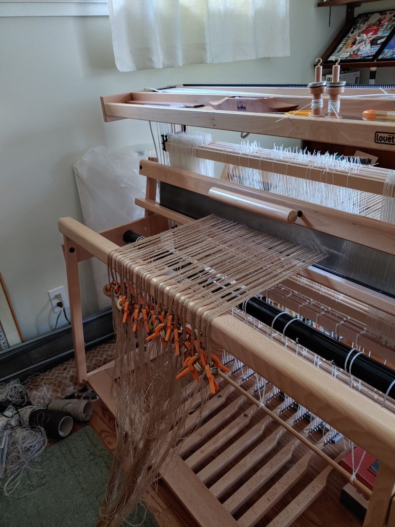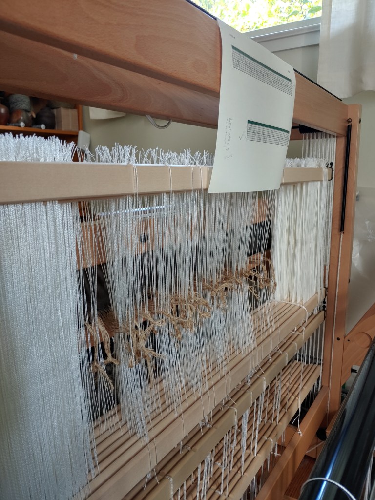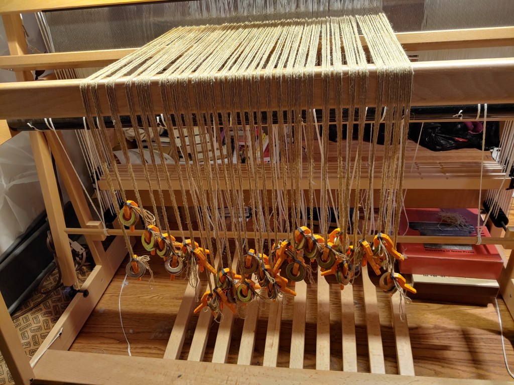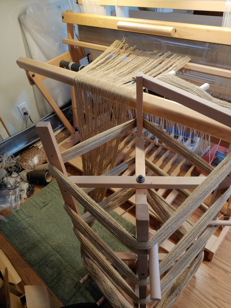 This one turned out better than many in that regard. It remained to tie these front ends onto the cloth beam and tie-up the treadles for the draft I chose.