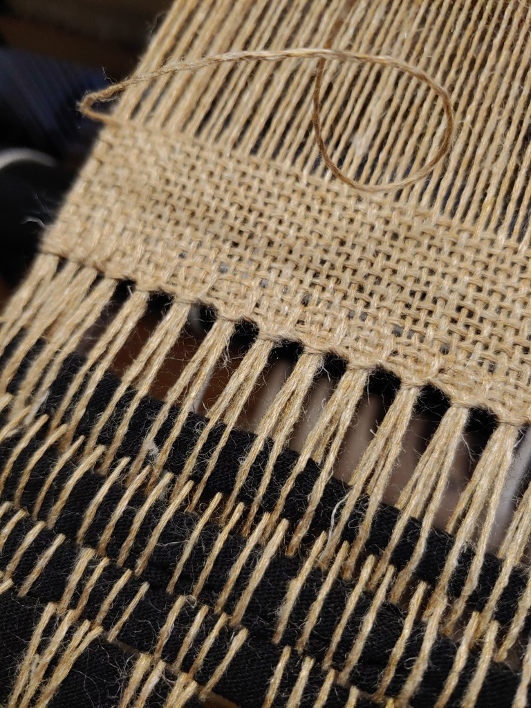 I decided to use doubled-up floating selvedges so I wound and hung them while doing the tie-ups. To buffer the warp-end displacements from tying the fronts it’s customary to “weave” some torn sheets (I use torn thrift-store tee shirts), and then I like to weave a few inches of tabby and hem-stitch the leading edge: