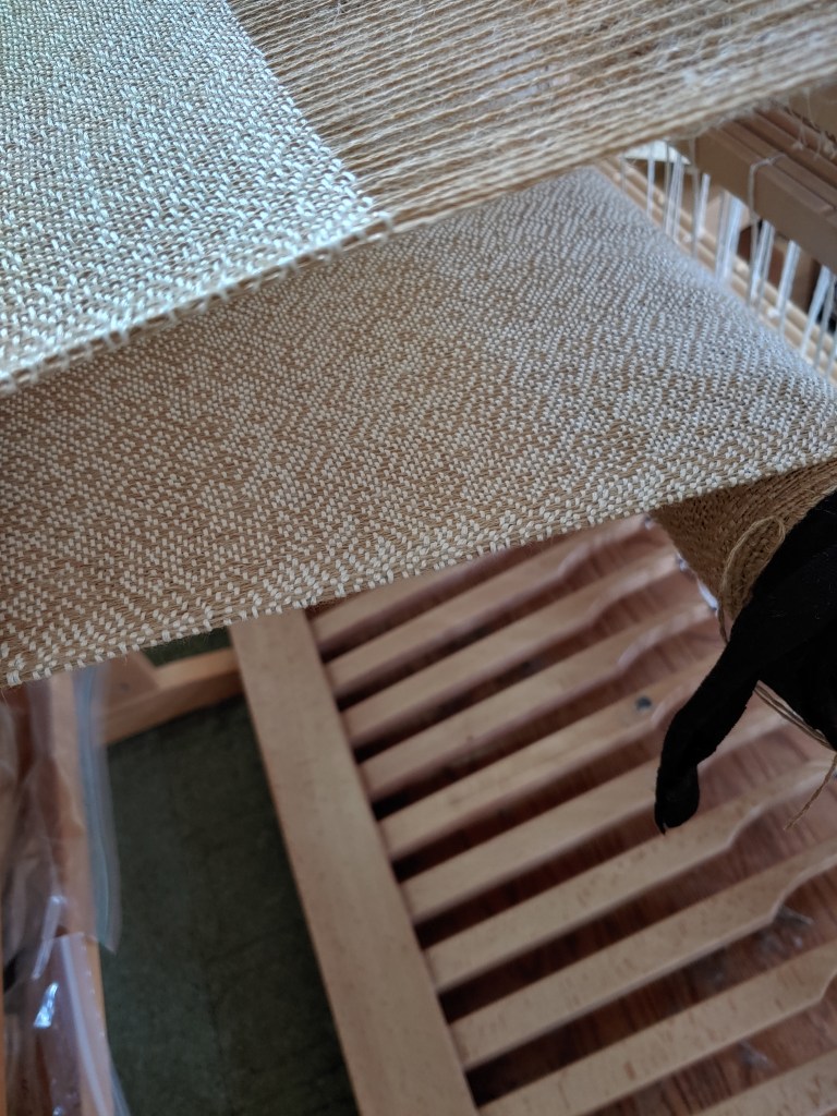 I finally started weaving the pattern on January 2, not quite to start the new year but not too far off. I’m a few feet in by now and have nearly worked out the finicky details of how best to set the warp tension, how much slack to give each pick, how hard to beat the fell, and so on. With the yarns I chose and the way I implemented the lift plan, the pattern seems to show up much better on the underside of the cloth than on the top that I see while I’m weaving: