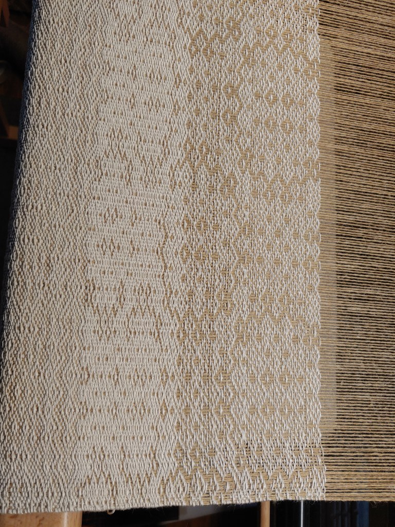 The image below shows the transition (left-to-right) from the original pattern I was weaving, to the new pattern with too high a pick density, to then the adjusted rhythm I’m going to stick with. It’s amazing how much the change of tie-up required such a drastic change in warp tension and weft slack. That’s all dictated by the change in the frequency with which each weft pick needs to transition from the upper-to-lower face of the cloth (and vice versa), as each such transition adds a warp yarn’s width-worth of length to the required weft slack. You can see clearly in the image below how the original pattern has dense transitions, while the new pattern has lots of long weft floats (where the weft stays above or below for several warp ends in a row). The new pattern shows a lot more warp; I’m excited to see how differently the two regions of the cloth look in indigo…