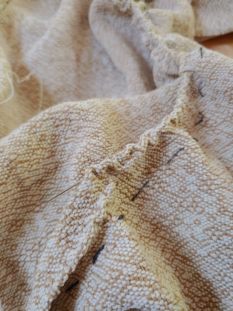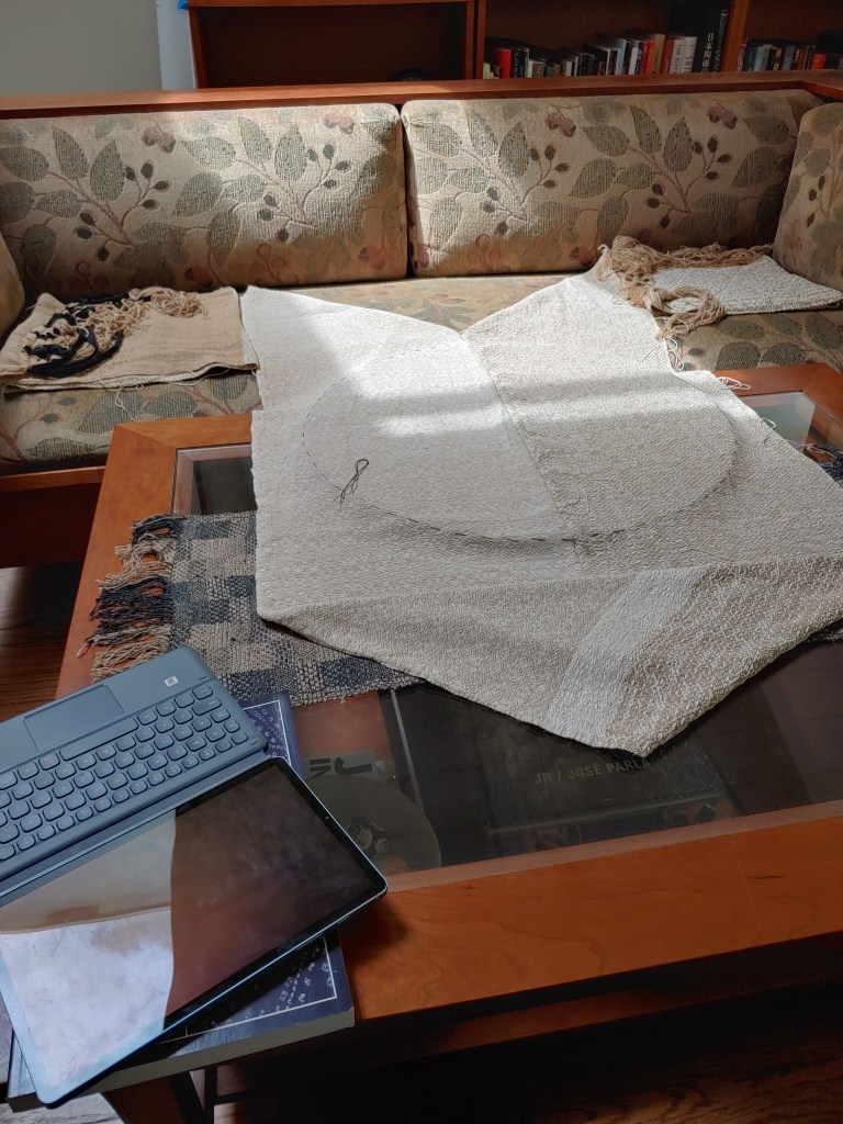 After cutting my yardage off the loom and giving it a quick wet-finish, I spent some time trying to decide what “shape” it should take in the final work. I ended up deciding on a hanging double-width panel (with a “display” area for indigo shibori something like 27″ square), with the remaining cloth to be used for some kind of draped/knotted trim. The first image in the above gallery shows the basic idea; there’s a 22″ diameter plywood circle under the panel that I’m using as a kind of template. The cloth is folded back on itself to make the double-width panel and I used a simple hem-stitch to join the edges.