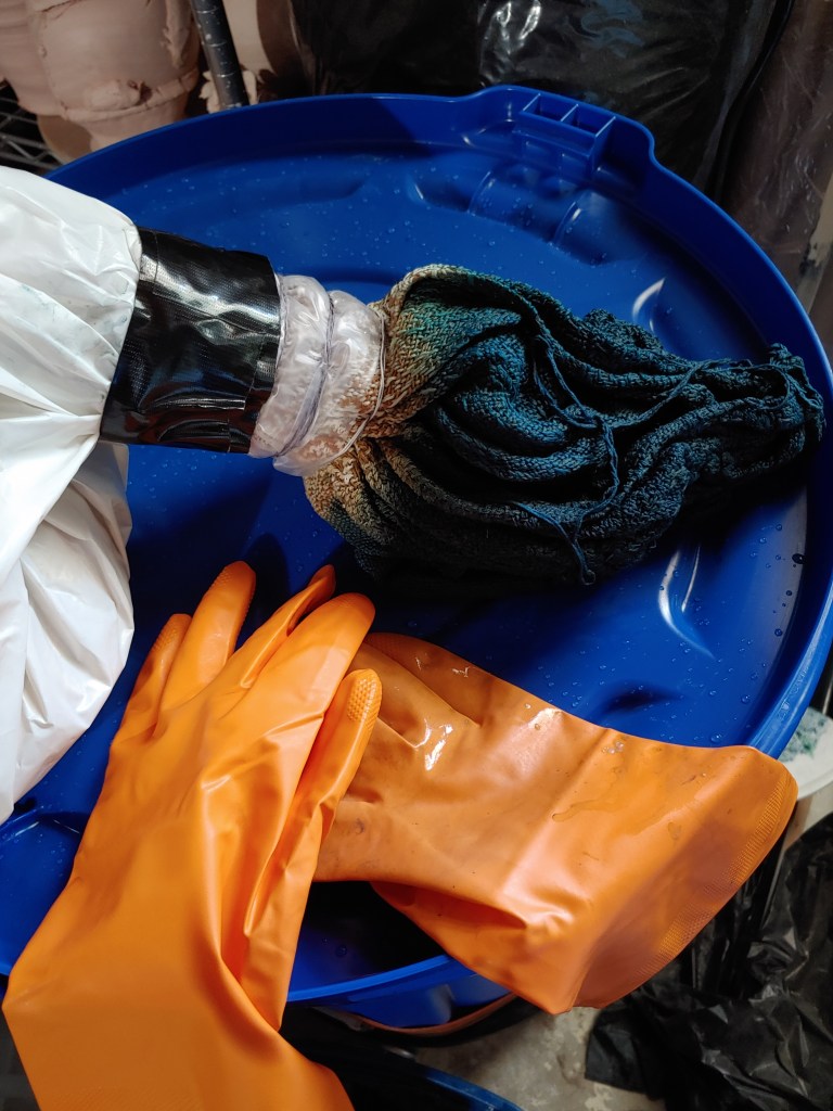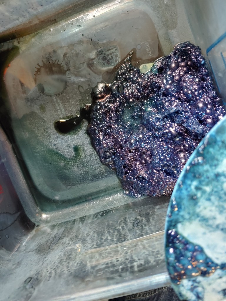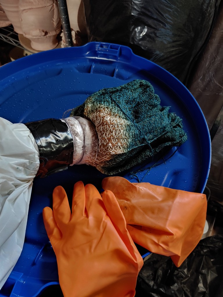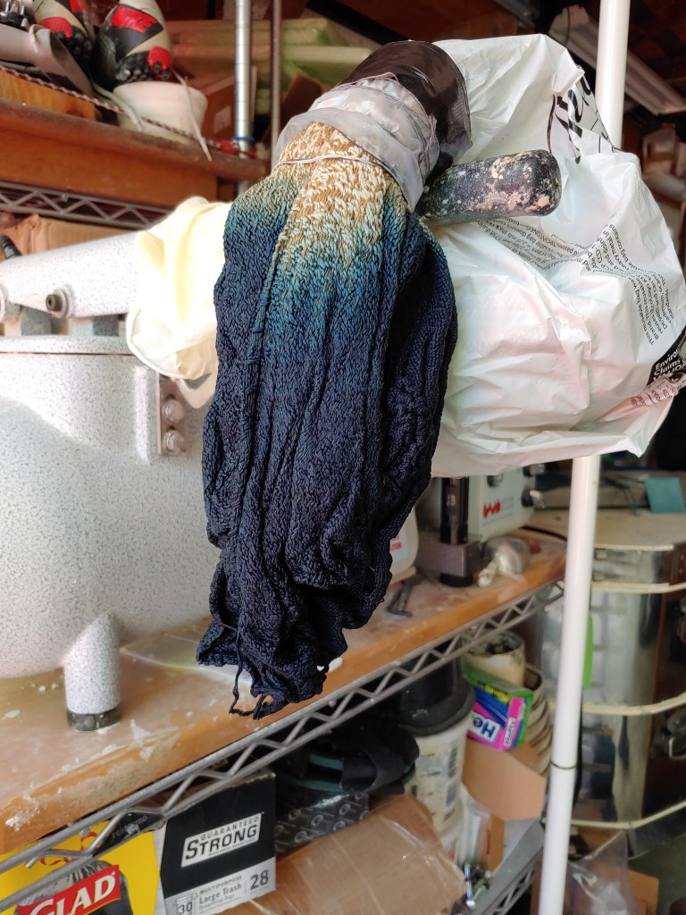 The cloth finally went in the indigo today — five dips at five minutes each, then a final pH-neutralizing soak in vinegar water. The indigo vat as mixed was sitting at pH 12.5 so I added fructose to bring it down to 11.5. That’s still high for dyeing silk but I figure my warp has a fair bit of linen in it and this isn’t going to be a functional piece anyway… I’m afraid to look!