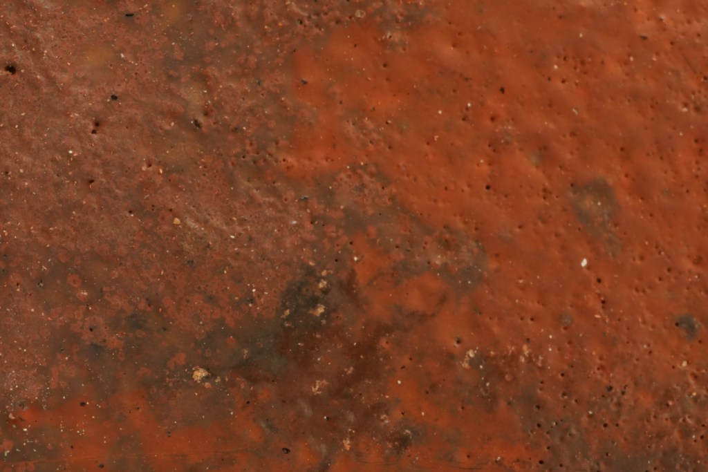 This microscope image is taken with direct LED ring-light illumination, against a dark background. It must be said the daylight digital camera image looks more true to color in terms of what one sees by eye, however, the microscope illumination setup is better for detailed studies in that it is much more precisely reproducible from one sample/image to the next. In both images it is clear that there are a range of purple-to-scarlet shades of what we would call patches of reduction-cool red (I’ve written about these on another website). The above microscope image was taken at a nominal magnification of 34x; here’s another montage of a smaller region within ROI1 taken at 155x (this is quite a large high-res file; to view in full resolution you’ll need to download the file and use an image viewer on your computer — click on the image here and then save the target file from the “view full size” button in the lower-right):