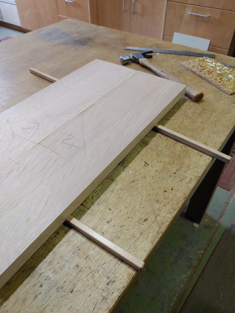 We then cut biscuit slots and applied glue (right image above), and then had to clamp the whole thing together in two stages. The images below of the clamped glue-up gives a feeling for the tooling and expertise required to do this well: