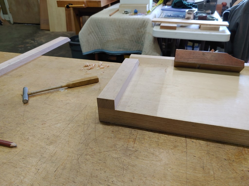 The left image above shows a special rig (also visible in the background of the center image) that Isaac calls the shooter, comprising a plane and alignment block that can be used to fine-tune the 45 degree angle cuts beyond the precision achievable with a miter saw. It took a while to get the hang of using the shooter and I’m still rather clumsy with it, but as we worked it became very clear how crucial it is to take the time for such fine-tuning in order to achieve nice clean joins without egregious gaps. A couple of views of the glued-up frame: