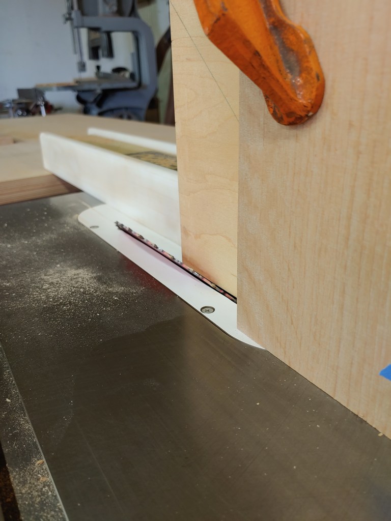 After the joined boards were dry, we first had to scrape down the seam to smooth and level (left image below), and then they were cut to dimension for the pedestal sides and ends. We then had to cut 45 degree bevels on all the edges to make the joins, which was done on a table saw using a fancy rig that Isaac made (center image below):