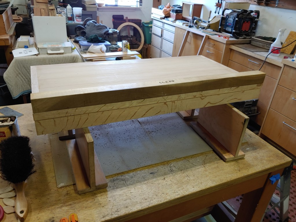 The most complicated piece was actually the top of the platform, which rests on a frame just like the cantilever frame shown above. The central area of the platform top is a lovely section of plywood, but it is framed-in by thin strips of the tanoak lumber that hide the plywood edges and match the grain of the support frame.
