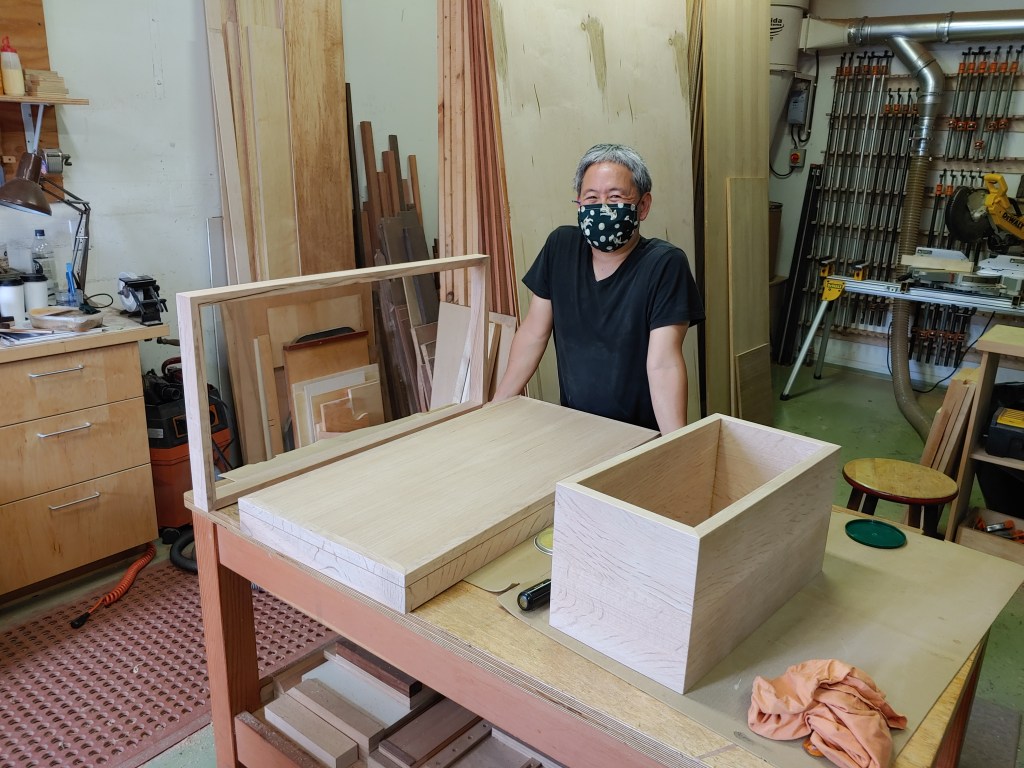 It’s really amazing to be able to work with Isaac in his studio — Isaac took the drawings I made and formulated a start-to-finish plan for fabricating the frame, platform and pedestal from stock planks of tanoak that he had in his inventory. The tanoak (Notholithocarpus densiflorus) was a local Fort Bragg tree that was milled and the lumber carefully dried as part of a workshop that Isaac participated in many years ago. The planks Isaac had were only 6″ wide, so after the rough milling we had to start by joining together some pieces side-by-side to make the 10″x20″ side and 10″x10″ end pieces for the pedestal: