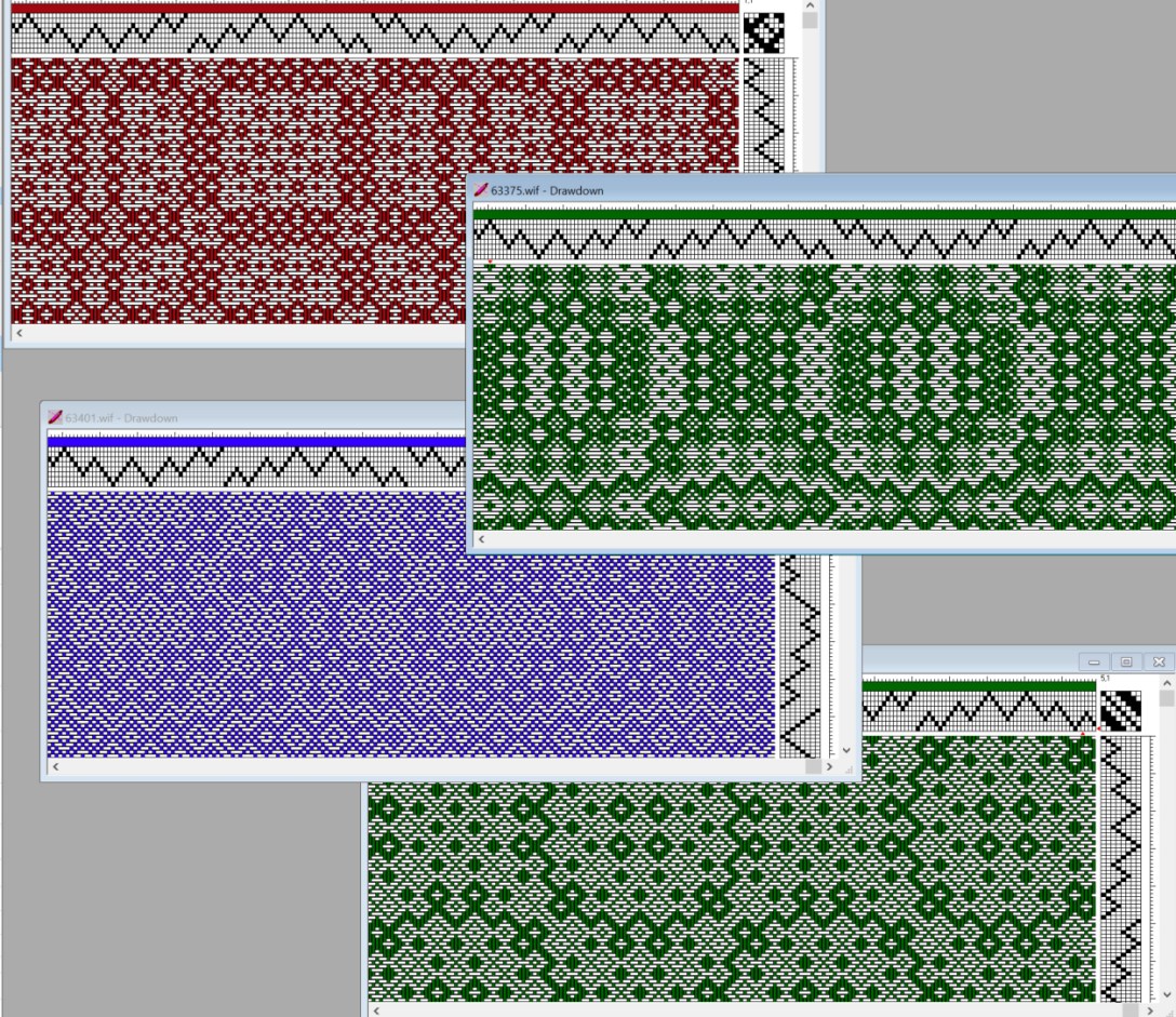 I think I'm ready to start working on some cloth. Browsing through handweaving.net I found a set of drafts that share a 98-end threading (#63401, #63375, #61552, #60935, ...) that would provide a nice range of patterns in light color contrast for subsequent dyeing, although the tie-ups would need to be changed among them...
